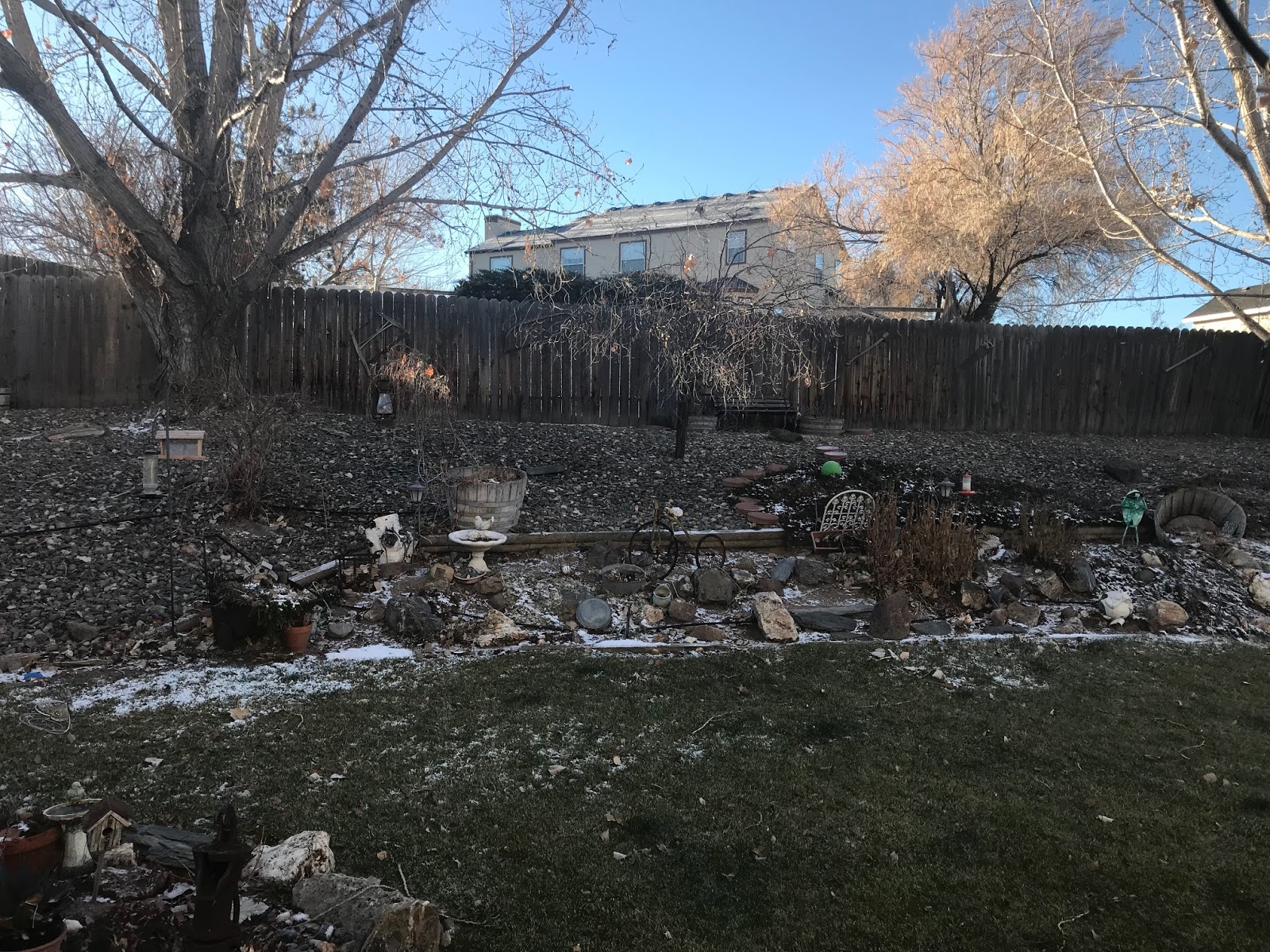The Yard looks pretty much the same--altho we did have a slight skiff of snow, which is pretty much gone except for the shaded areas.